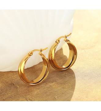 Az Isla aranyozott nemesacél karika fülbevaló egy elegáns és divatos kiegészítő, amely tökéletesen passzol minden stílushoz. A fülbevaló hipoallergén 316L nemesacélból készült, így bőrbarát és kényelmes viselet. Az 1,7 cm külső átmérővel rendelkező fülbevaló 18k arany bevonattal van ellátva.