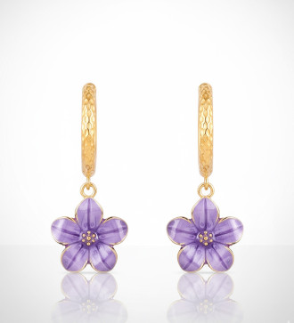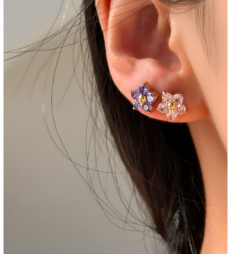 Egy csipetnyi elegancia a mindennapokra. Kristályvirág nemesacél fülbevaló, amely a lila cirkónia kristályok és arany bevonatának köszönhetően különleges ragyogást kölcsönöz viselőjének. Hipoallergén anyagból készült, ideális minden bőrtípus számára.