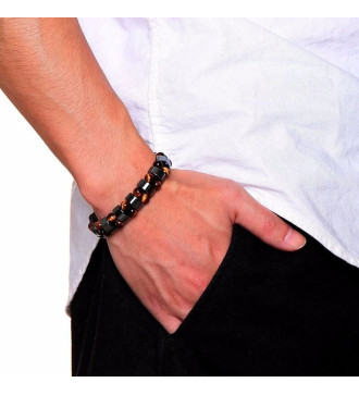Stílusos, letisztult férfi karkötő fonott bőrből, középen hurkolt díszítéssel. A fekete nemesacél gomb tökéletesen kiegészíti a modern, elegáns megjelenést.